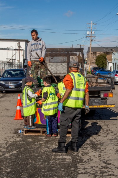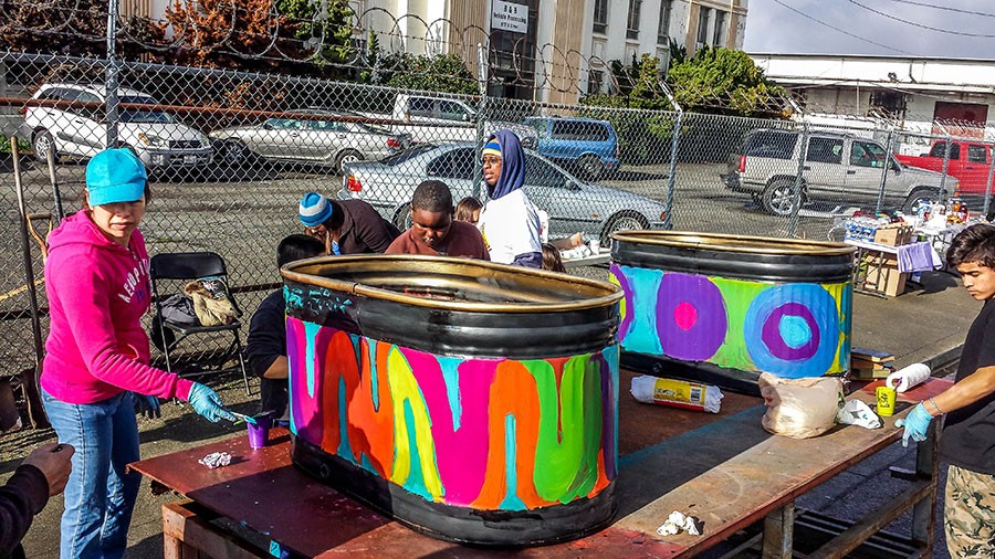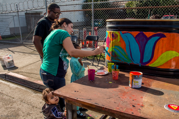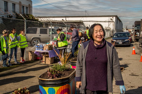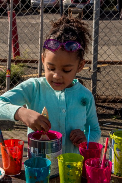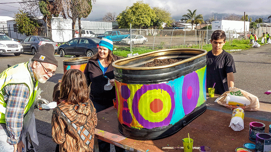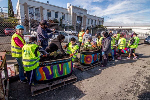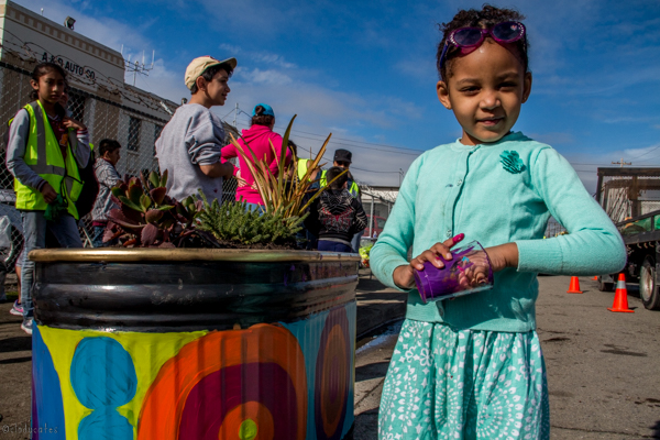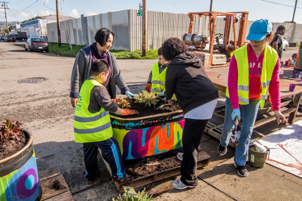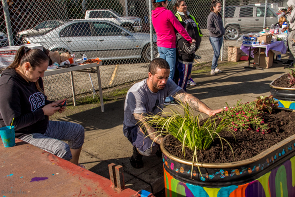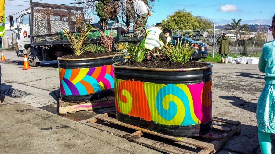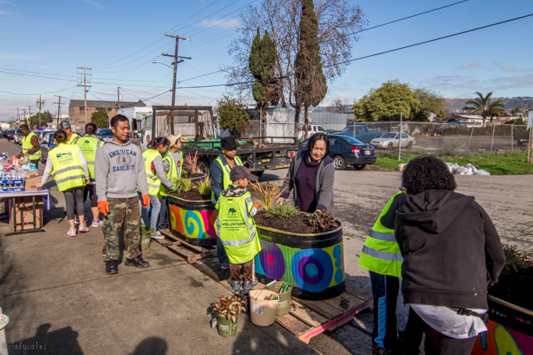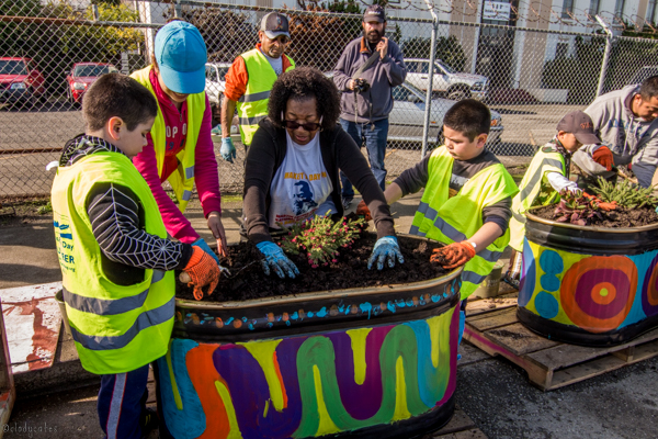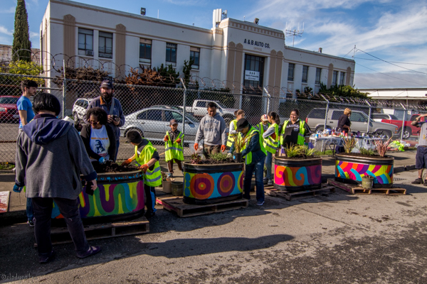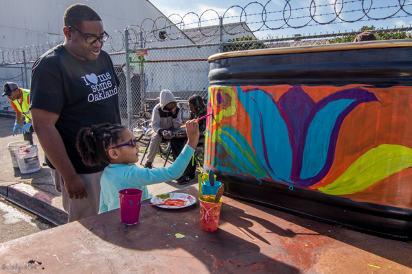 Volunteers from NIMBY met up with the Block by Block Organizing Network, District 7, group (BBBOND7) on Monday January 18th for the annual Martin Luther King Jr. Day of Service. Volunteers from BBBOND7 cleaned up the neighborhood and planted flowers. The artists from NIMBY worked with the children to paint and place 5 flower planters to bring some color to G Street. Former Oakland Mayor Jean Quan stopped by and got in on the action, painting with the kids and lending a hand.