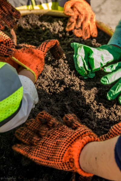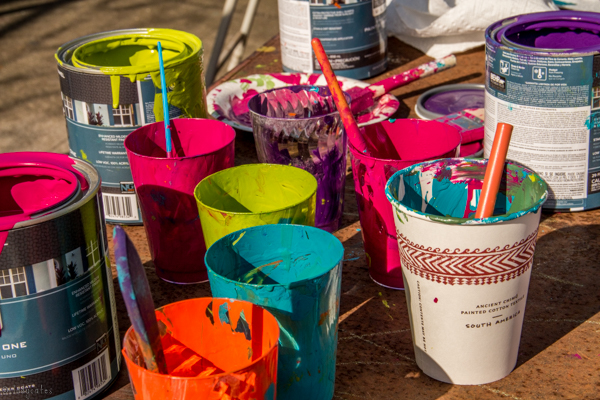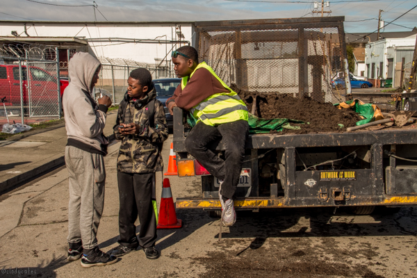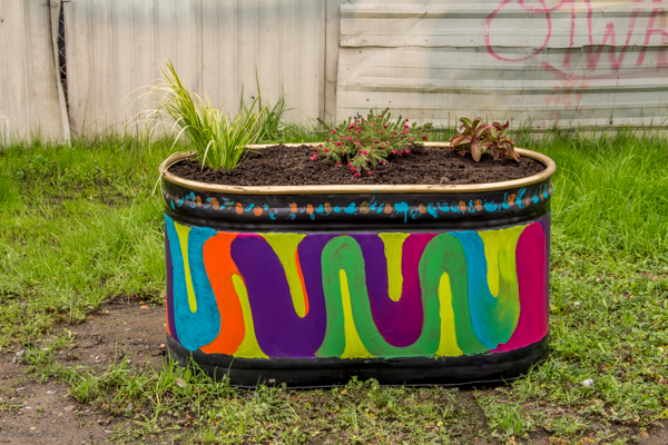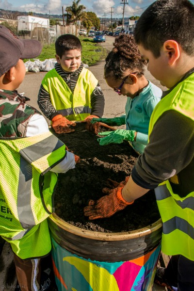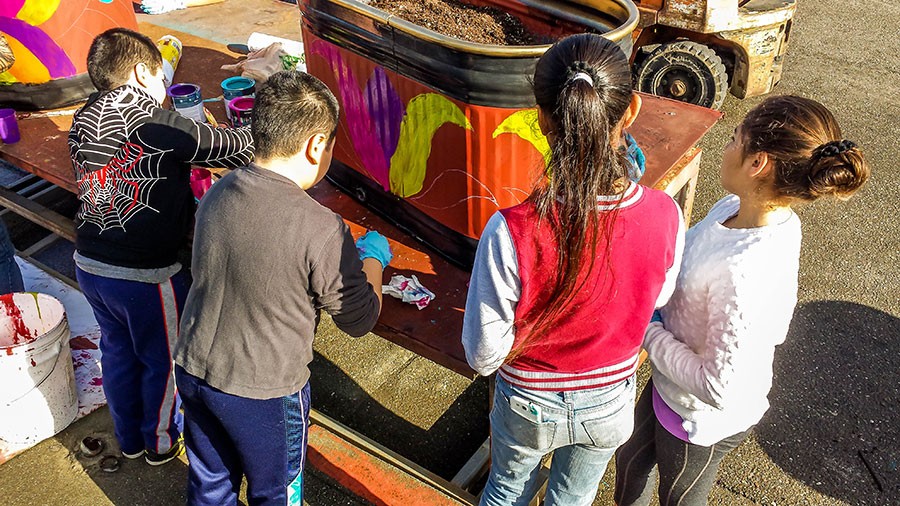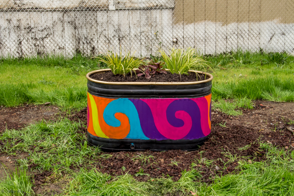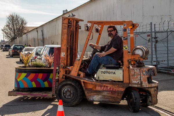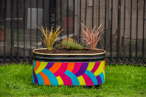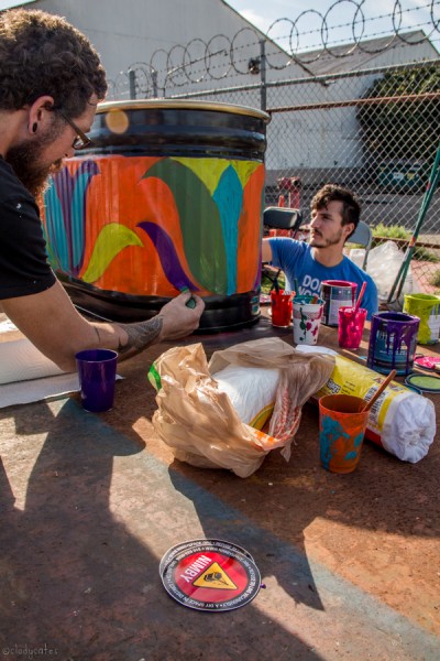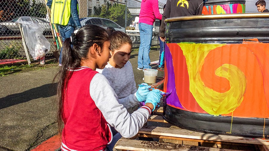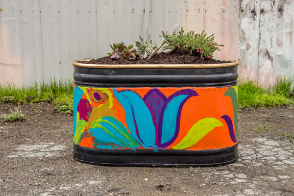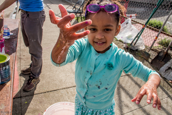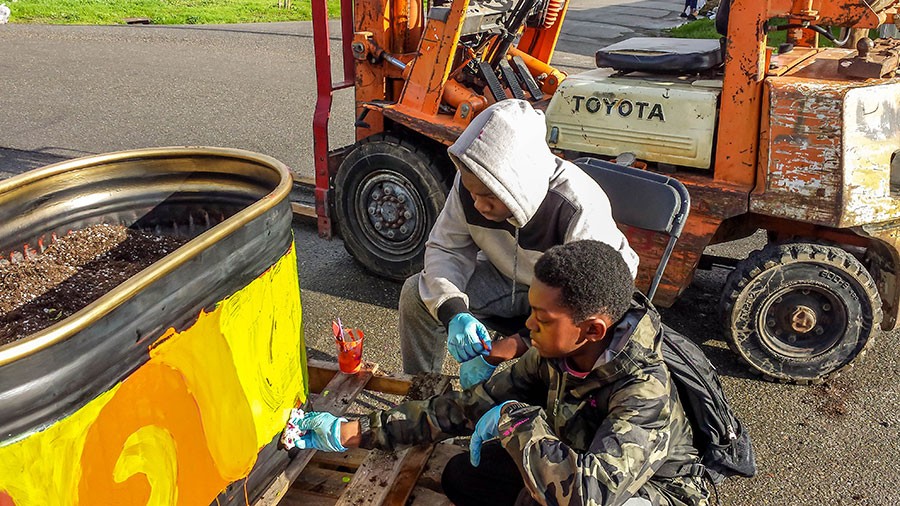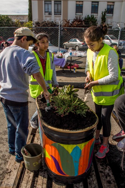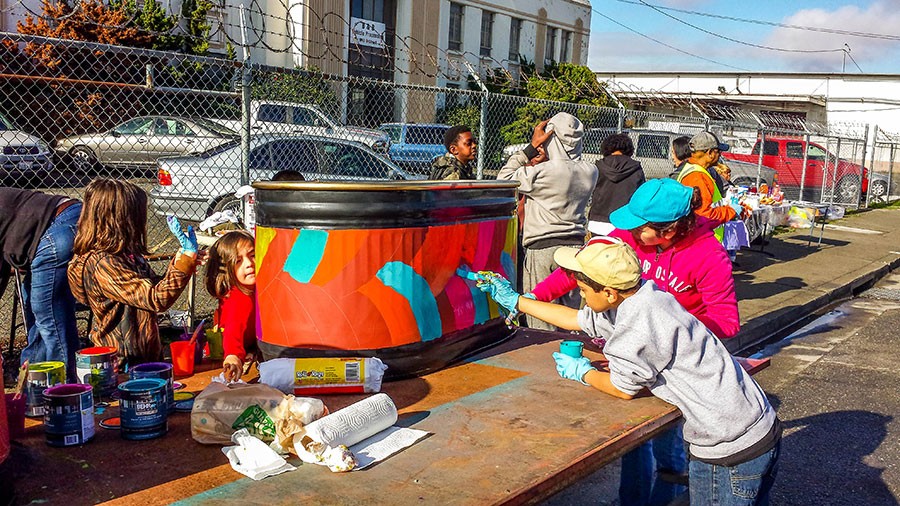 Volunteers from NIMBY met up with the Block by Block Organizing Network, District 7, group (BBBOND7) on Monday January 18th for the annual Martin Luther King Jr. Day of Service. Volunteers from BBBOND7 cleaned up the neighborhood and planted flowers. The artists from NIMBY worked with the children to paint and place 5 flower planters to bring some color to G Street. Former Oakland Mayor Jean Quan stopped by and got in on the action, painting with the kids and lending a hand.